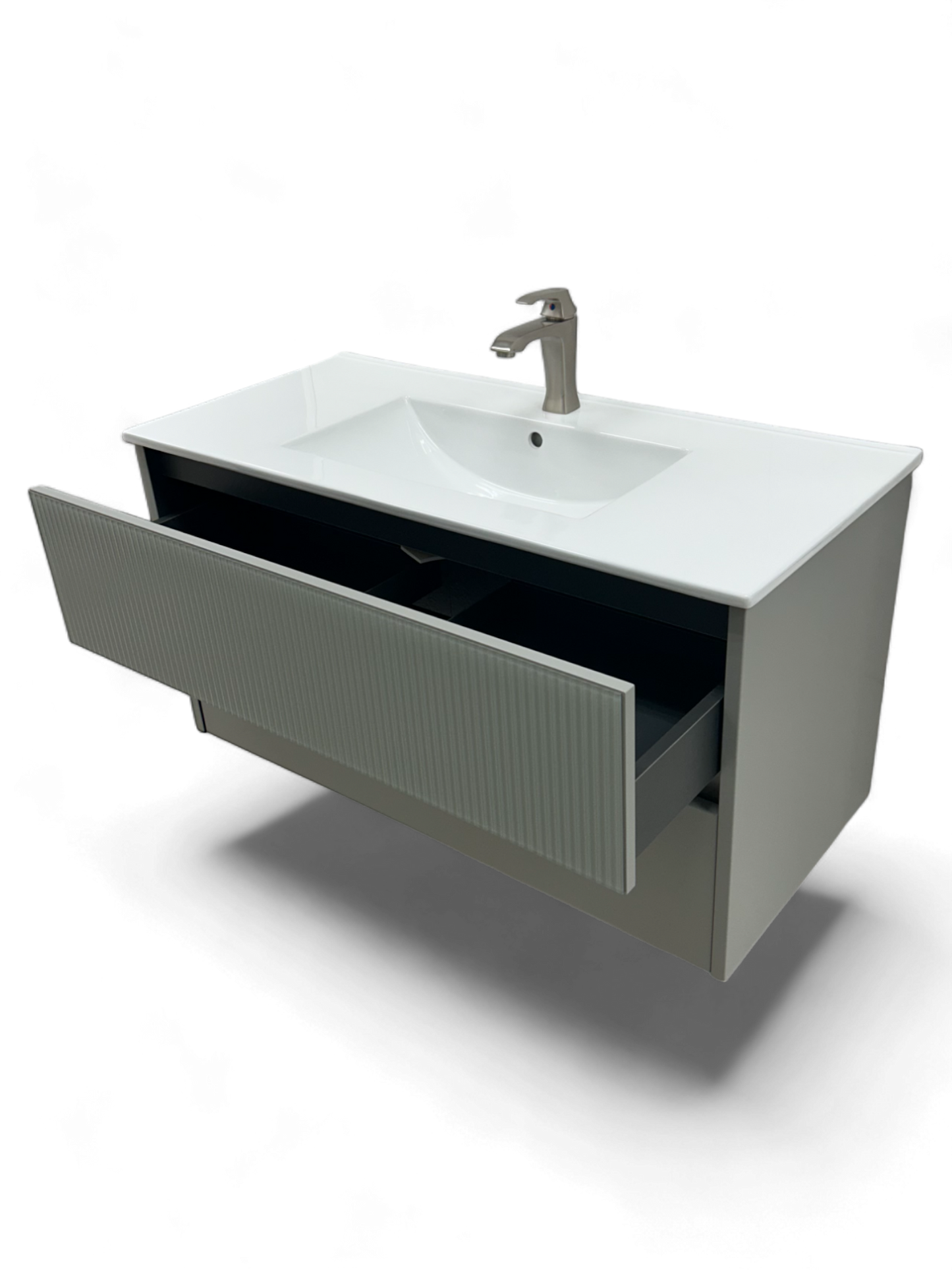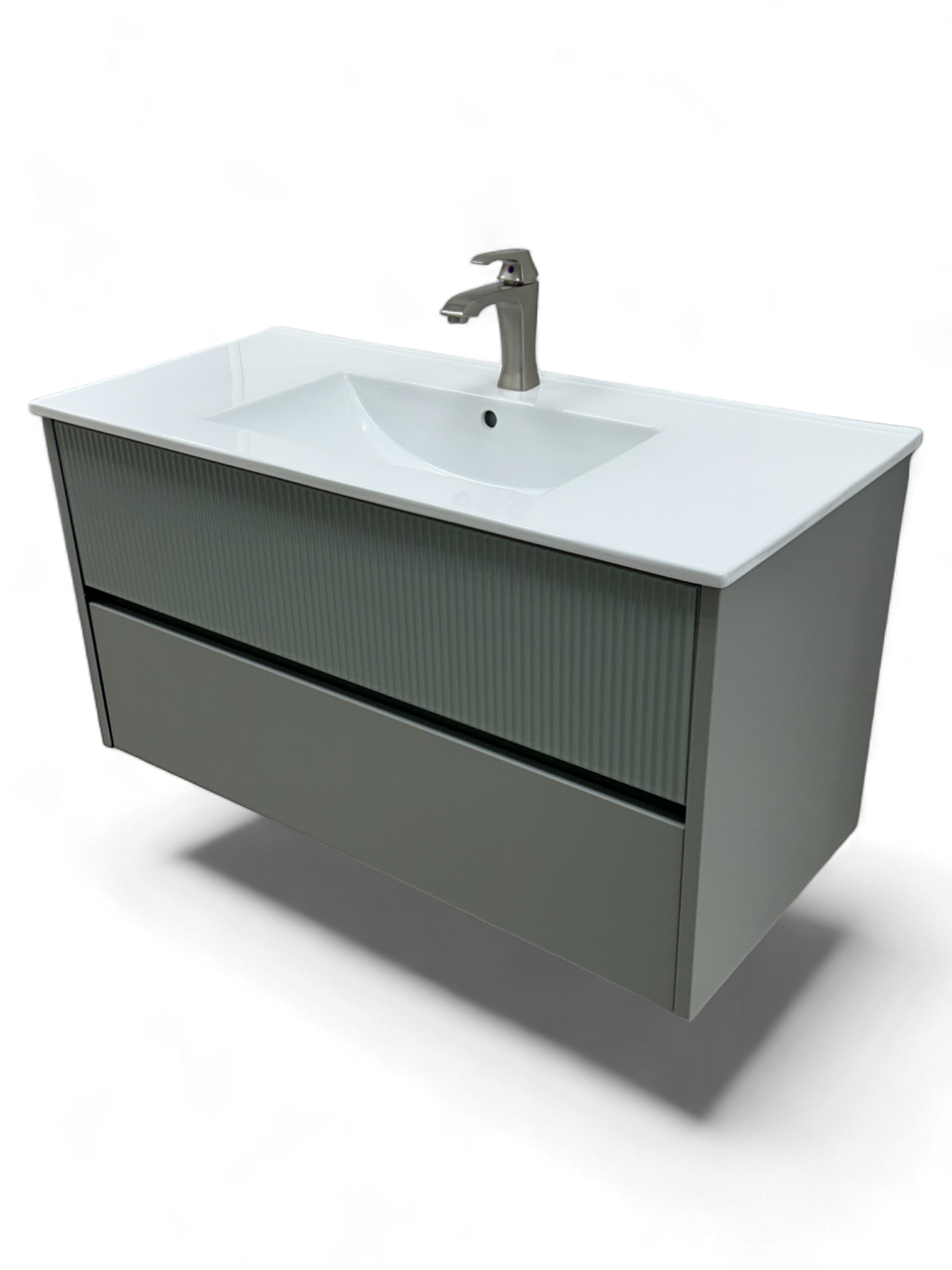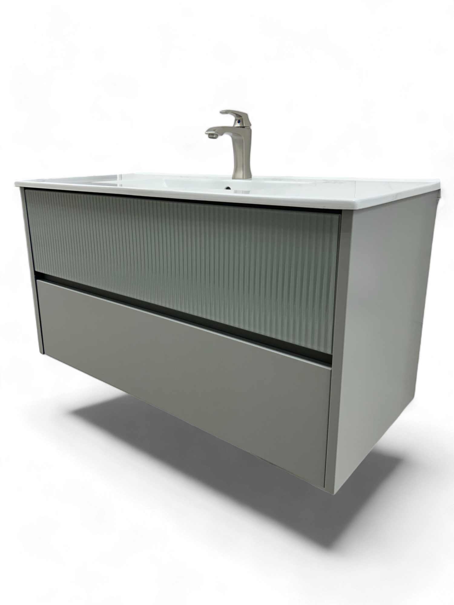 Introducing our Paris Grey Wall-Mounted Vanity, featuring a stunning crystal accent on the first drawer that enhances its appearance with captivating reflections and plays beautifully with light. This sleek and elegant design is crafted to elevate your bathroom decor. The minimalist aesthetic, coupled with the matt grey finish, radiates sophistication and a modern appeal. With its wall-mounted configuration, this vanity not only offers a sleek profile but also boasts two drawers equipped with a soft closing system, ensuring both functionality and style without compromise.